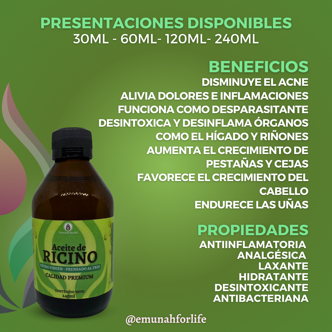 El aceite de ricino se obtiene de las semillas de la planta Ricinus communis, otorgando múltiples propiedades a nuestro organismo como: