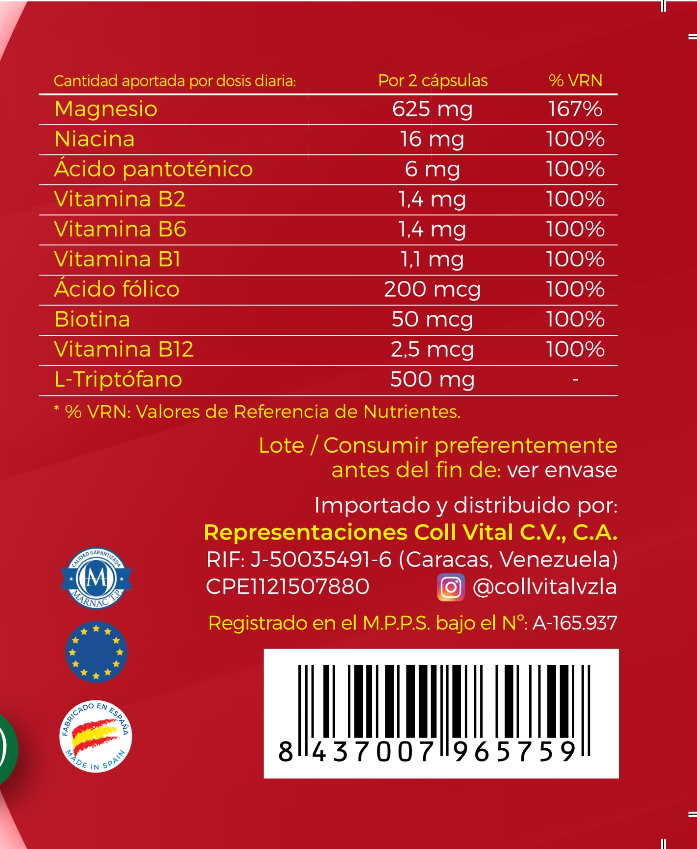 Ahí es donde entran las vitaminas del complejo B, especialmente B6, B9 (ácido fólico) y B12. Estas vitaminas son fundamentales para que el triptófano se transforme en serotonina y melatonina. Además, mejoran la función cognitiva, la concentración y el metabolismo energético. En conjunto, esta fórmula apoya el equilibrio emocional, combate la fatiga mental y física, y favorece un descanso profundo.