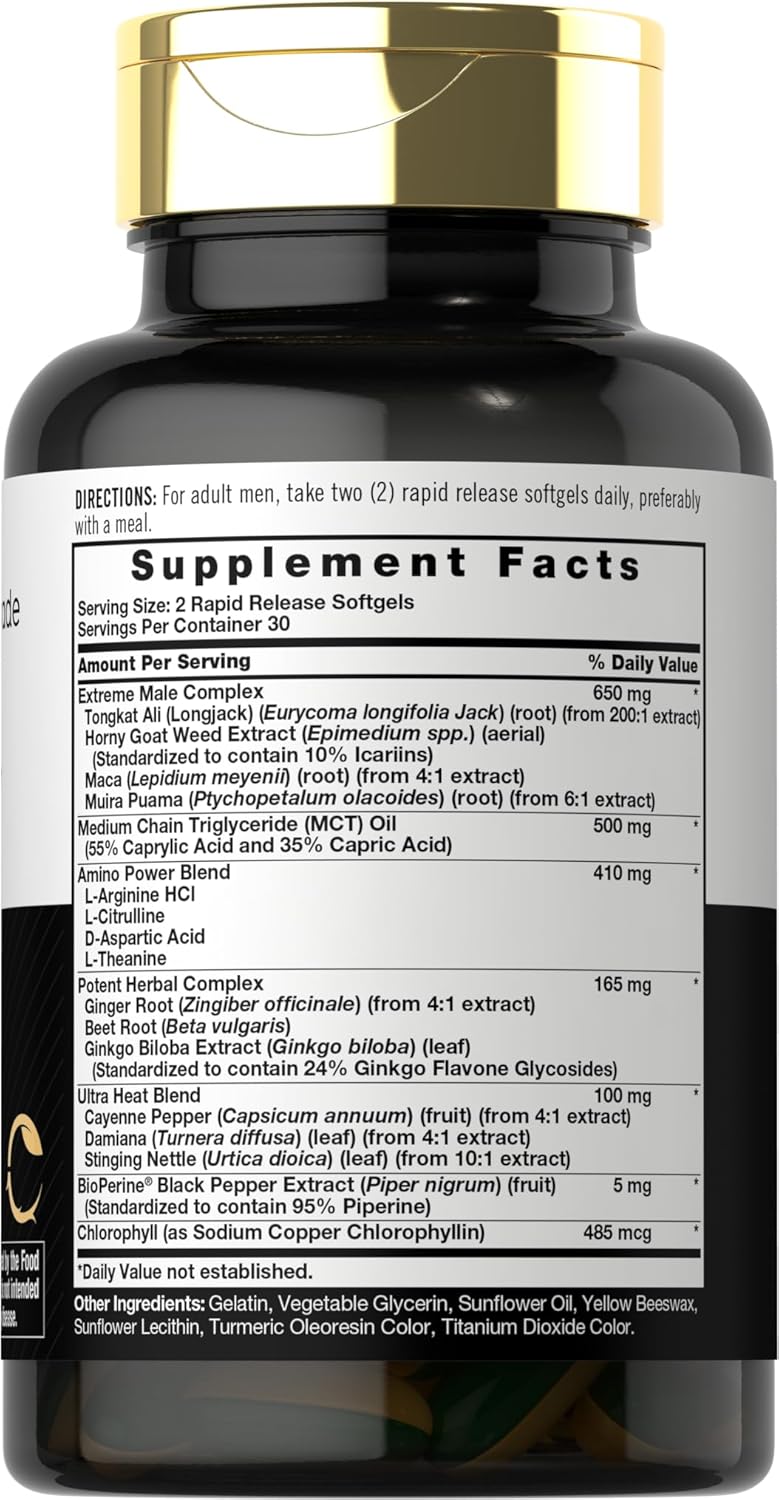Formulado como un complejo para rendimiento masculino, este producto combina extractos herbales, aminoácidos, lípidos MCT y potenciadores de absorción para apoyar libido, energía, rendimiento físico, recuperación y función vascular.